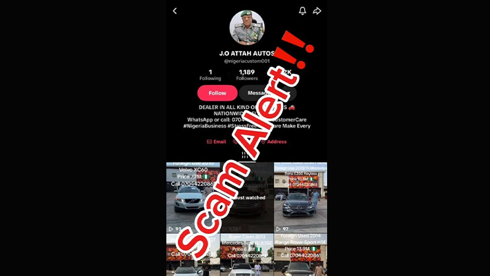 The News Agency of Nigeria (NAN) reports that the Instagram page with the handle @nigeriacustoms001 features discounted pictures of vehicles with a phone number attached, targeting potential buyers unaware of the fraud.