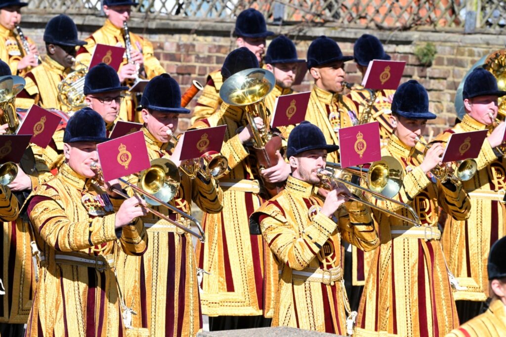 Upon reaching the Quadrangle, they were greeted by a Guard of Honour from the 1st Battalion Grenadier Guards, with the Royal Standard, Corps of Drums, and Regimental Band.