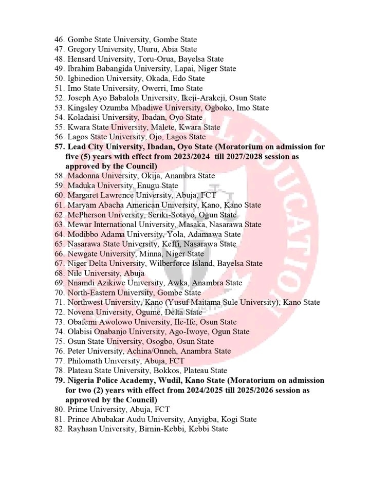 - Lead City University, Ibadan, Oyo State (Moratorium on admission for five (5) years with effect from 2023/2024 till 2027/2028 session as approved by the Council)