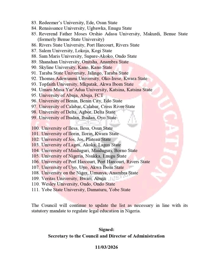 The council added that it would continue to update the list in line with its mandate to regulate legal education in Nigeria.
