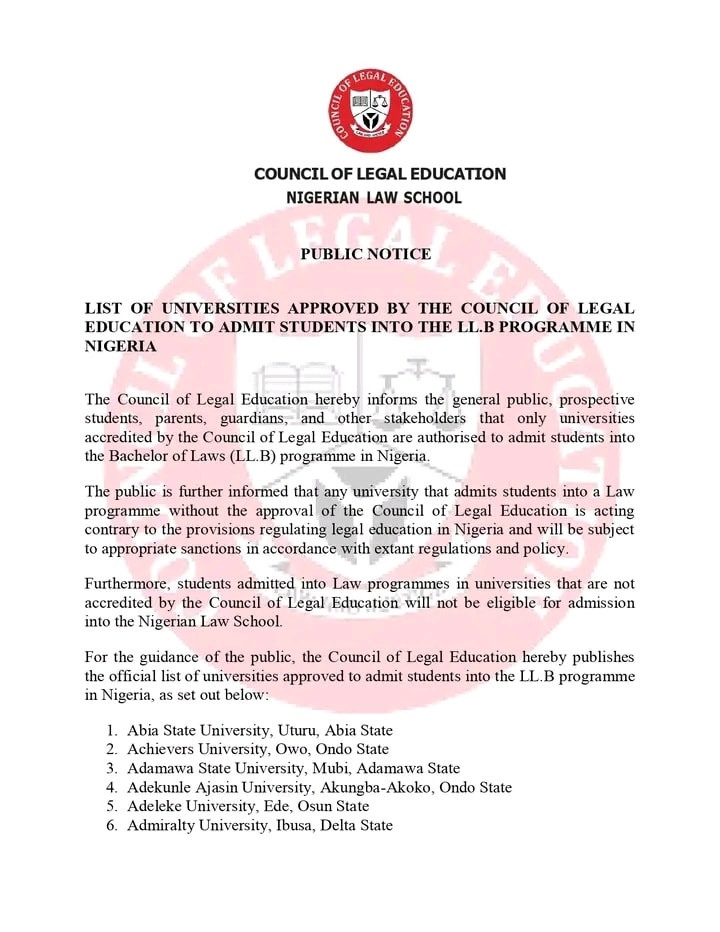 “The public is further informed that any university that admits students into a law programme without the approval of the Council of Legal Education is acting contrary to the provisions regulating legal education in Nigeria and will be subject to appropriate sanctions,” the circular stated.
