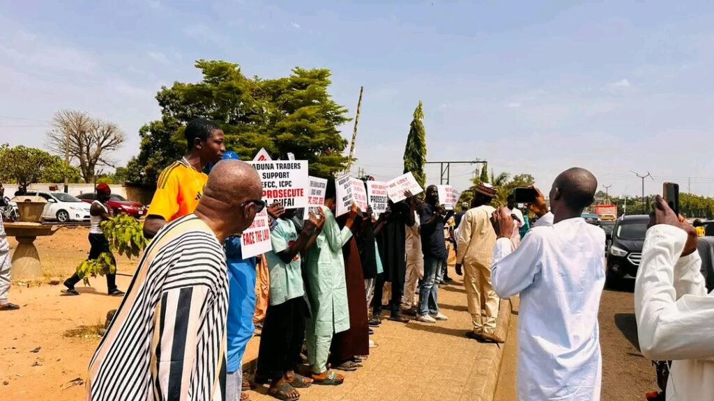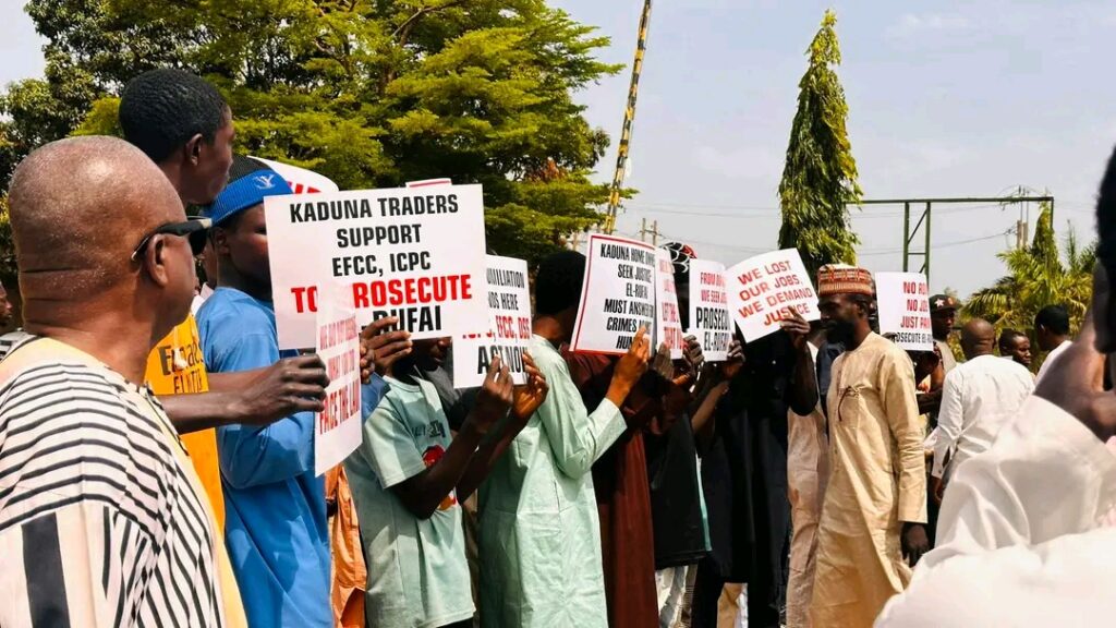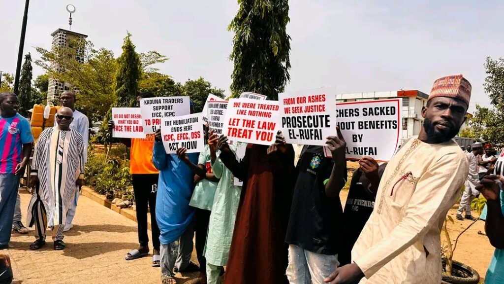 Residents gathered outside, chanting slogans and holding placards demanding justice for the hardships they claim El-Rufai caused during his tenure.