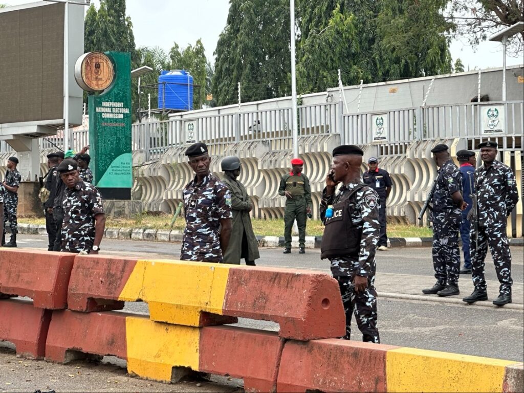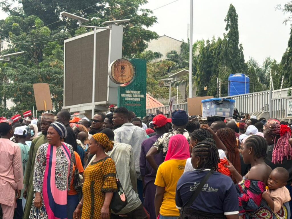 Tension flared outside an office of the Independent National Electoral Commission as a crowd of protesters gathered, demanding access but were stopped by officers of the Nigeria Police Force.